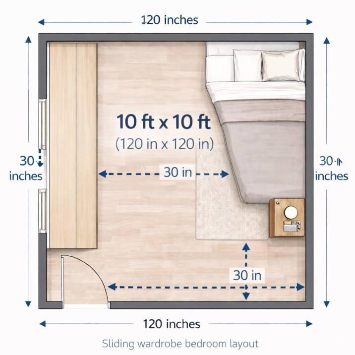 Always maintain at least 24–30 inches of walking space around the bed and wardrobe.